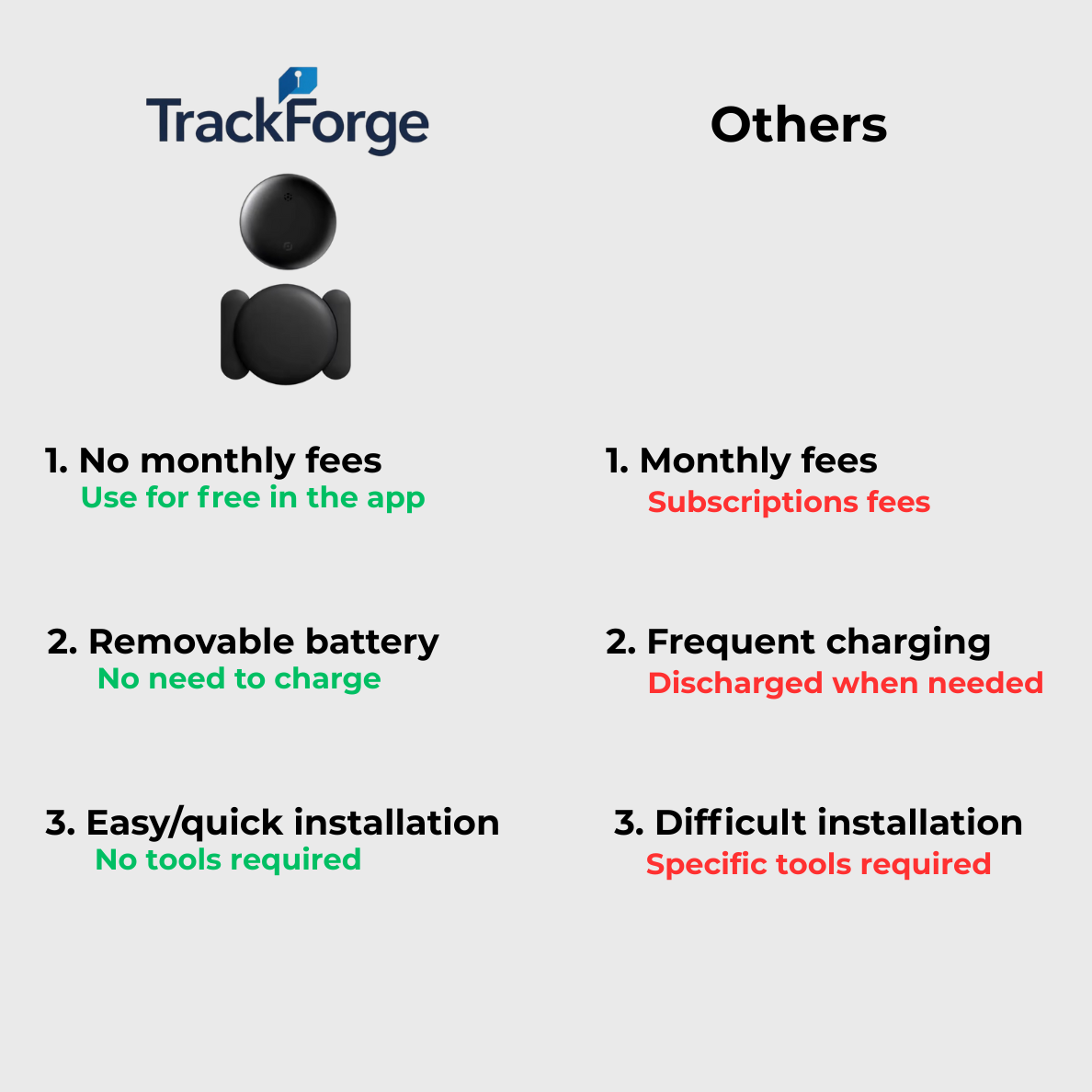 TrackForge has a long-lasting battery that lasts up to 12 months. When the battery runs out, you can easily replace it with a new CR2032 battery.